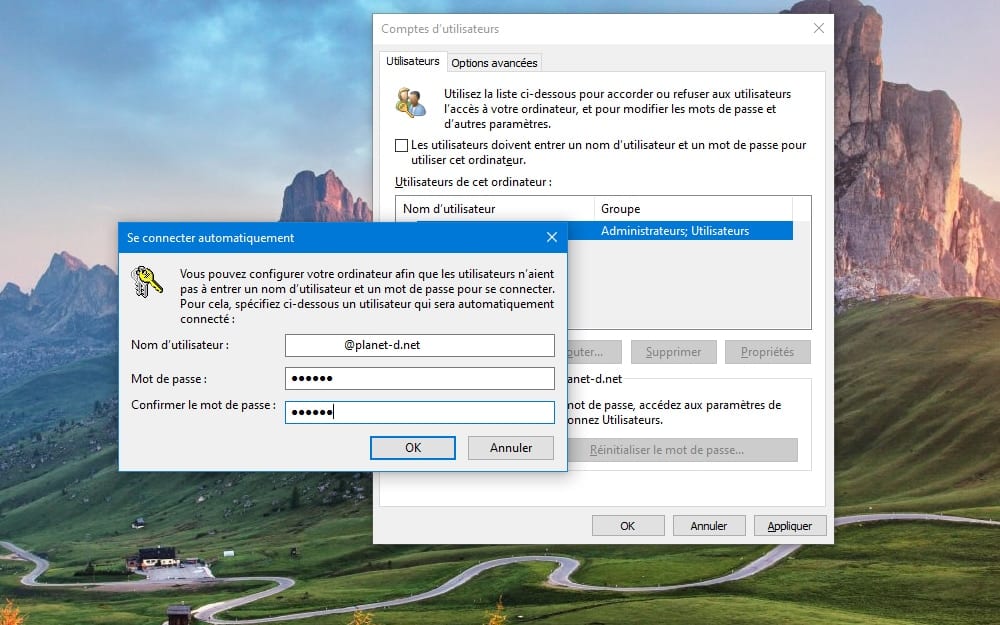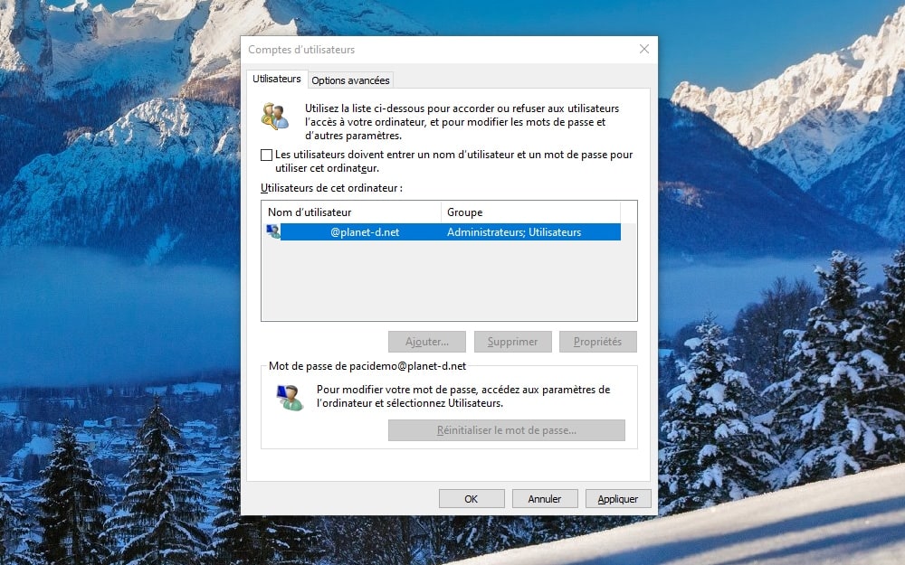 - Le gestionnaire des comptes utilisateurs s’affiche. Repérez la case Les utilisateurs doivent entrer un nom d’utilisateur et un mot de passe pour utiliser cet ordinateur et décochez-la. Cliquez sur Appliquer.
