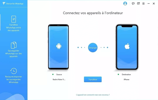 Il faut d’abord ouvrir le logiciel iTransor for WhatsApp et connecter votre ancien et nouveau téléphone grâce à un câble USB. N’oubliez pas d’autoriser l’accès aux données. Une fois que les appareils sont bien connectés et iTransor lancé, il suffit de cliquer sur « transférer ». Nous conseillons de faire une sauvegarde avant le transfert afin d’être certain de ne pas perdre les données. Lors de la copie, les données sur le téléphone source sont supprimées.