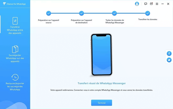 Le transfert fonctionne avec un iPhone comme un Android. Concernant l’iPhone, sachez qu’il faut penser à installer l’application WhatsApp et enlever la localisation de l’Phone sur le téléphone cible. En revanche, pour un transfert entre deux smartphones Android le logiciel s’occupe d’installer WhatsApp en version personnalisée.