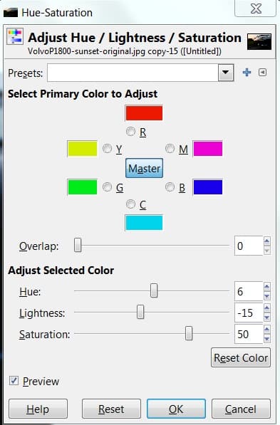 Poursuivons avec un ajustement dans Teinte, Légèreté, Saturation (sous Couleurs > Teinte-Saturation) :